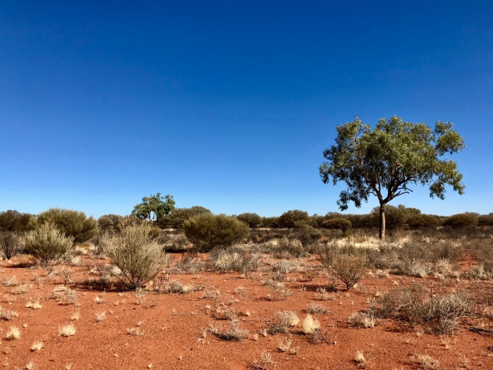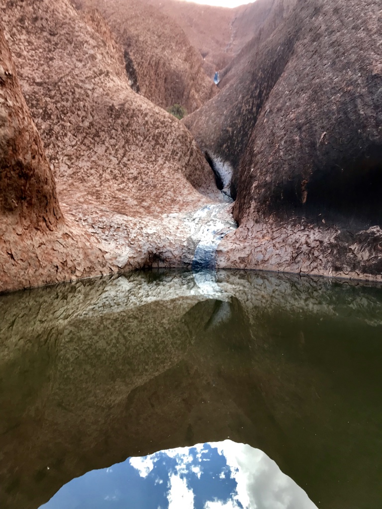 Im Schatten einer Felsformation sammelt sich Wasser. Man könnte es einen Tümpel nennen. Sofort beginnt das Leben, sich den Raum zurück zu erobern. Einige Pflanzen und sogar Bäume wachsen um ihn herum. Auf einem Hinweisschild lese ich, das es am Uluru eine grössere Artenvielfalt gibt, als sich mir auf den ersten und ungeschulten Blick (ohne Brille) erschliesst: 416 Pflanzenarten, 26 verschiedene Säugetiere (und weitere 20 sind bereits ausgestorben), 173 Vogelarten, 73 verschiedene Reptilien, vier Froschtypen sowie über Tausend Spezies von wirbellosen Tieren. Vereinzelt hören wir Vogelgezwitscher und hoffen, das sie doch bitte einige der Buschfliegen jagen und verspeisen mögen. Aber Hilfe ist von den kleinen gefiederten Freunden nicht zu erwarten. Es ist früher Nachmittag und brütend heiss. Die drei Liter Wasser sind nach etwa einem Drittel des Weges zur Hälfte verbraucht.