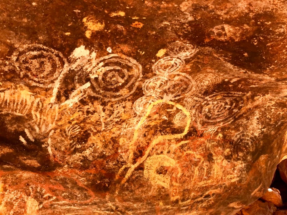 Bemerkenswert sind auch die Höhlenmalereien, die an wenigen ausgesuchten Plätzen vorzufinden sind. Über deren Alter erfahren wir nichts, stellen uns aber vor, wie hier bereits vor bis zu 40.000 Jahren die Vorfahren der Anangu ihre Lebensweise pflegten. Das hierarchische System innerhalb der weitverzweigten Aboriginistämme soll sehr komplex gewesen und in seiner Detailiertheit (nicht in seiner Auswirkung) dem des Kastensystems in Indien vergleichbar sein. Die über ganz Australien verteilten Stämme waren miteinander verbunden. Sie haben (wie andere sogenannte Naturvölker auch) im Einklang mit der Natur gelebt und sich als ein Teil von ihr, nicht über sie stehend, verstanden. Rund zweihundert Jahre nach der Kolonialisierung und Ausbeutung von Rohstoffen, Flora und Fauna, kann auch in diesem Teil der Erde, wie anderswo auch, von einem Gleichgewicht zwischen den berechtigten Interessen der Menschen und dem Recht aller anderen Lebewesen auf ihren eigenen Lebensraum keine Rede sein.