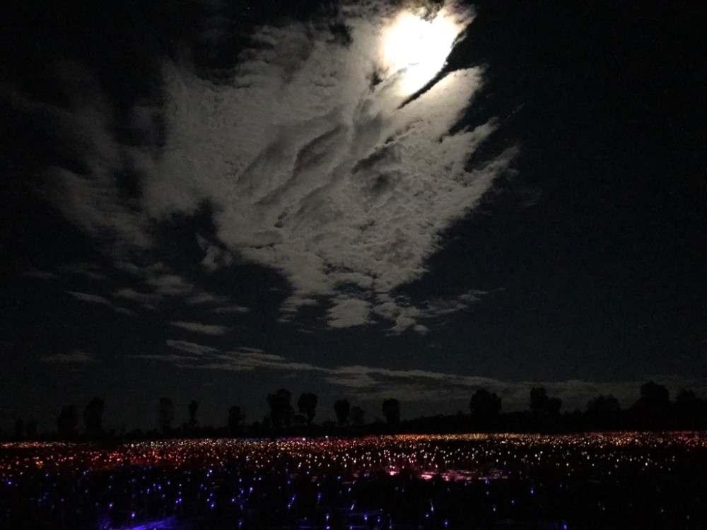 Warum nenne ich ihn magisch? Weil er jenseits der Mythen und Geschichten um ihn, allein schon aufgrund seiner Erscheinung auf mich wie dahin gezaubert wirkt, wie ein riesiges Raumschiff auf einer flachen Ebene. Er ändert seine Farben wie ein Chamäleon, wenngleich ihn das Rot der Erde berühmt gemacht hat. Wir dürfen dieses Farbenspiel nochmal am folgenden Morgen beobachten. Neben den natürlichen Farbgebungen hat ein Künstler ein Lichterfeld installiert, welches mit seiner Vielfalt eine wunderbare Ergänzung zum natürlich Gegebenen darstellt. Die Verbindung von Kunst und Natur ist hier gelungen.