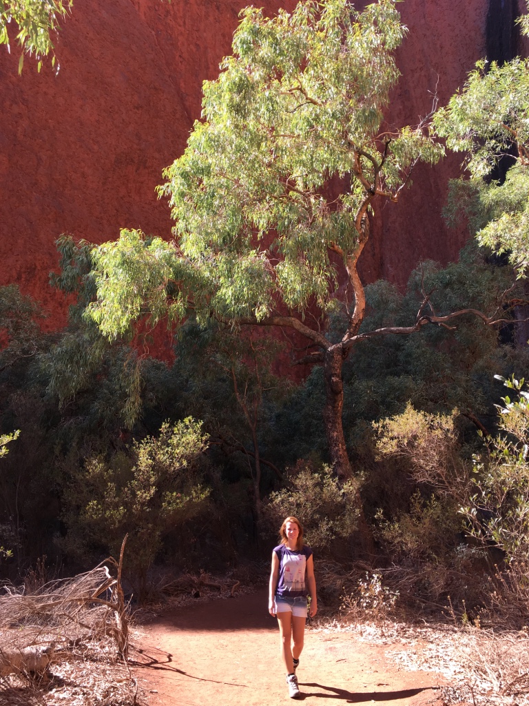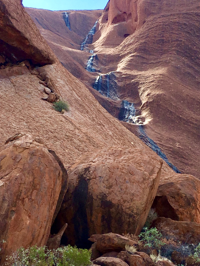 Nun zum interessanten Teil: der etwa zehn Kilometer langen Wanderweg rund um den roten, braunen oder grauen Felsen. Die Farben wechseln je nach Lichteinfall und Uhrzeit, was nicht unbedingt einander bedingen muss. Ich staune über bizarre Felsformationen, die die Anangu teilweise als rituelle Orte genutzt haben. So hatten bestimmte Felsvorsprünge ihre Bestimmung als Rückzugsort für die Geburt, als Schule oder für Initiationsriten heranwachsender junger Männer.