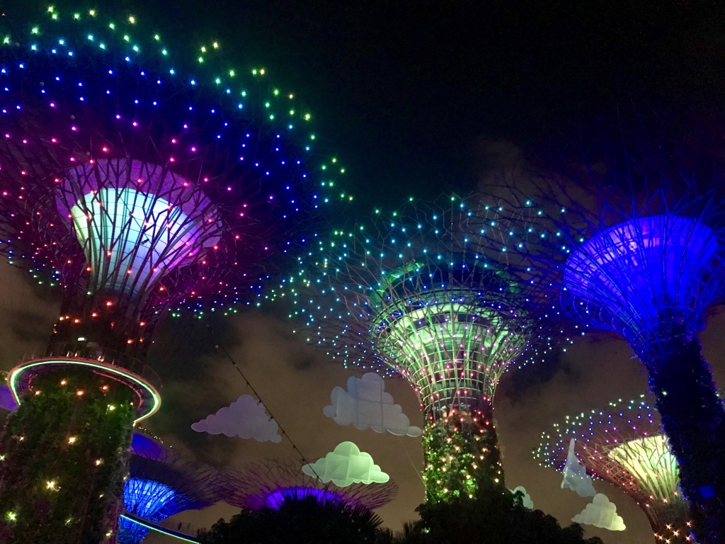 Markant sind die sogenannten Supertrees, Stahlgestelle in Form von Bäumen, die von innen und aussen begrünt sind und am Abend zu klassischer oder Popmusik ein Feuerwerk an bunten Lichtern versprühen. Spannend ist, das diese Bäume über einen Lift „erklommen“ und dadurch quasi auf Höhe der Baumkronen mit einer Brücke verbunden und somit begehbar sind. Von hier haben wir einen guten Überblick über den Park.