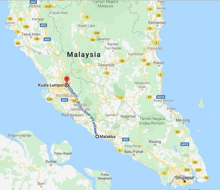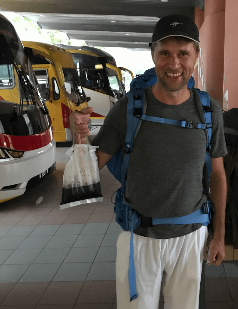Von Mersing an der Westküste der Halbinsel nehmen wir einen Bus nach Melaka. Für die 250 Kilometer braucht der Bus ungefähr vier Stunden. Das ist mir zu lange, um die Fahrt ohne meinen geliebten Kaffee anzutreten. Zum Glück gibt es auch hier überall reichlich Essenangebote und so bestelle ich einen Kaffee zum Mitnehmen. Anstatt eines Bechers gibt es allerdings eine Plastiktüte mit brauner Brühe.