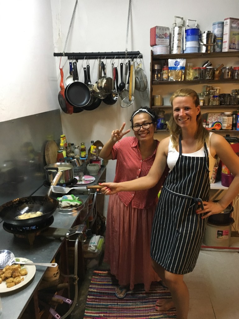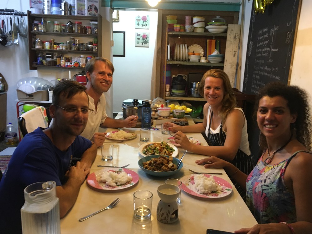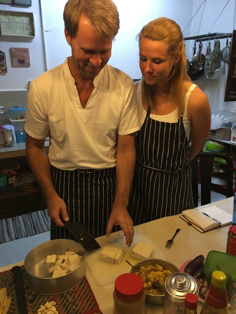 Zusammen mit anderen Besuchern auf Zeit nehmen wir das Angebot an und kochen einen Abend lang gemeinsam mit unseren Gastgebern in der grossen offenen Küche, in der wir sonst frühstücken. Unserem Wunsch entsprechend gibt es ein vegetarisches Menü. Ich lerne von unseren Mitköchen, wie man argentinische Empanadas liebevoll füllt und den Teig richtig mit kleinen Zöpfchen schliesst. Die Zutaten sind alle frisch und reichlich. Die von Teena gezauberte malaiische Tofuvariante kannte ich nicht, schmeckt mir aber ganz besonders gut.