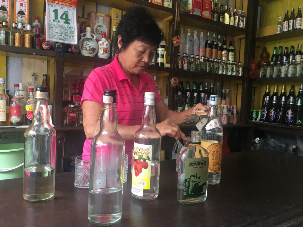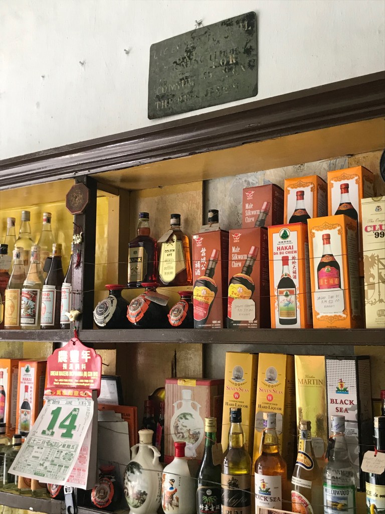 Als wir davor stehen, wirkt das verschlossene Gitter abweisend. Es dauert jedoch nicht lang, bis eine kleine ältere chinesisch aussehende Dame freundlich lächelnd öffnet. Sie wischt den Staub von den Barhockern und vom Tresen und bietet uns verschiedenes an Hochprozentigem in kleinen Verkostungsgläsern an. Zunächst schnuppere ich vorsichtig an den unterschiedlichen Flaschenöffnungen bis ich mich dann für einen …na, ihr wisst es schon: Kaffeeschnaps entscheide. Es brennt in der Kehle, aber irgendwie fühlt es sich nach dem üppigen Essen auch gut im Bauch an. Wir erfahren, das die Lizenz nur erhalten bleibt, wenn die Bar weiter von der Familie betrieben wird. Ihr Mann ist leider krank und ihr jüngster Sohn kann nicht immer unterstützen. Auch wenn die Regalwand mit all den unterschiedlichen Feuerwässerchen beeindruckt, bleibt mir nicht verborgen, das die besten Tage dieser Bar schon lange vorbei sind. Wer weiss, vielleicht wird dieses Kleinod seine Türen bald für immer schliessen.