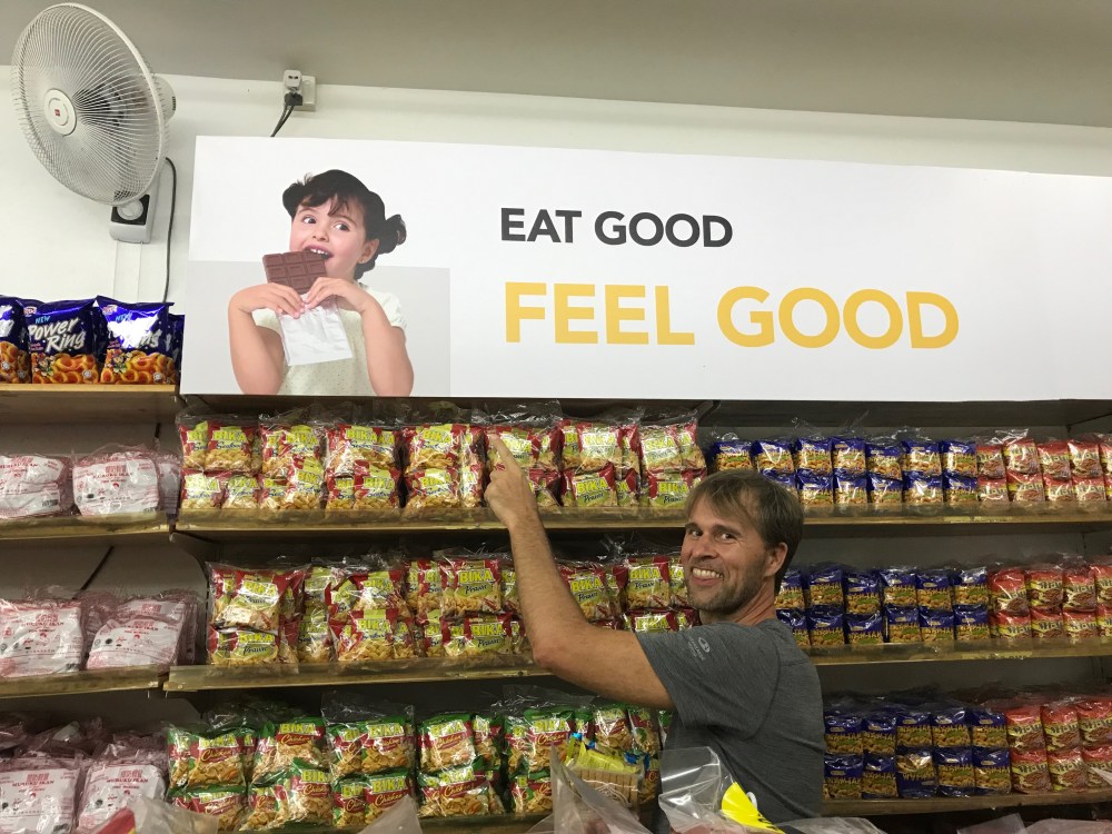 Bei unseren Einkäufen entdecken wir hin und wieder kuriose Produktempfehlungen, die so wohl nur hier funktionieren. Auf diesem Werbeplakat über dem Schokoladenregal ist ein Wonneproppen zu sehen, der lustvoll in eine grosse Tafel Schokolade beisst. Daneben steht „Eat good, feel good“ (Ernähre Dich gut. Fühle dich gut). Jana und ich schmunzeln uns mit grossen Augen an. Wir liegen wohl nicht falsch, wenn wir behaupten, das so etwas zuhause zu einem mittleren Shitstorm gegen die Handelskette und den Hersteller führen würde.