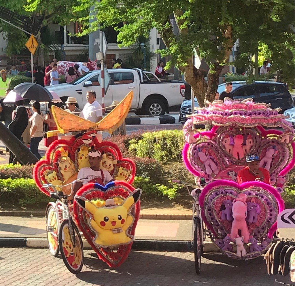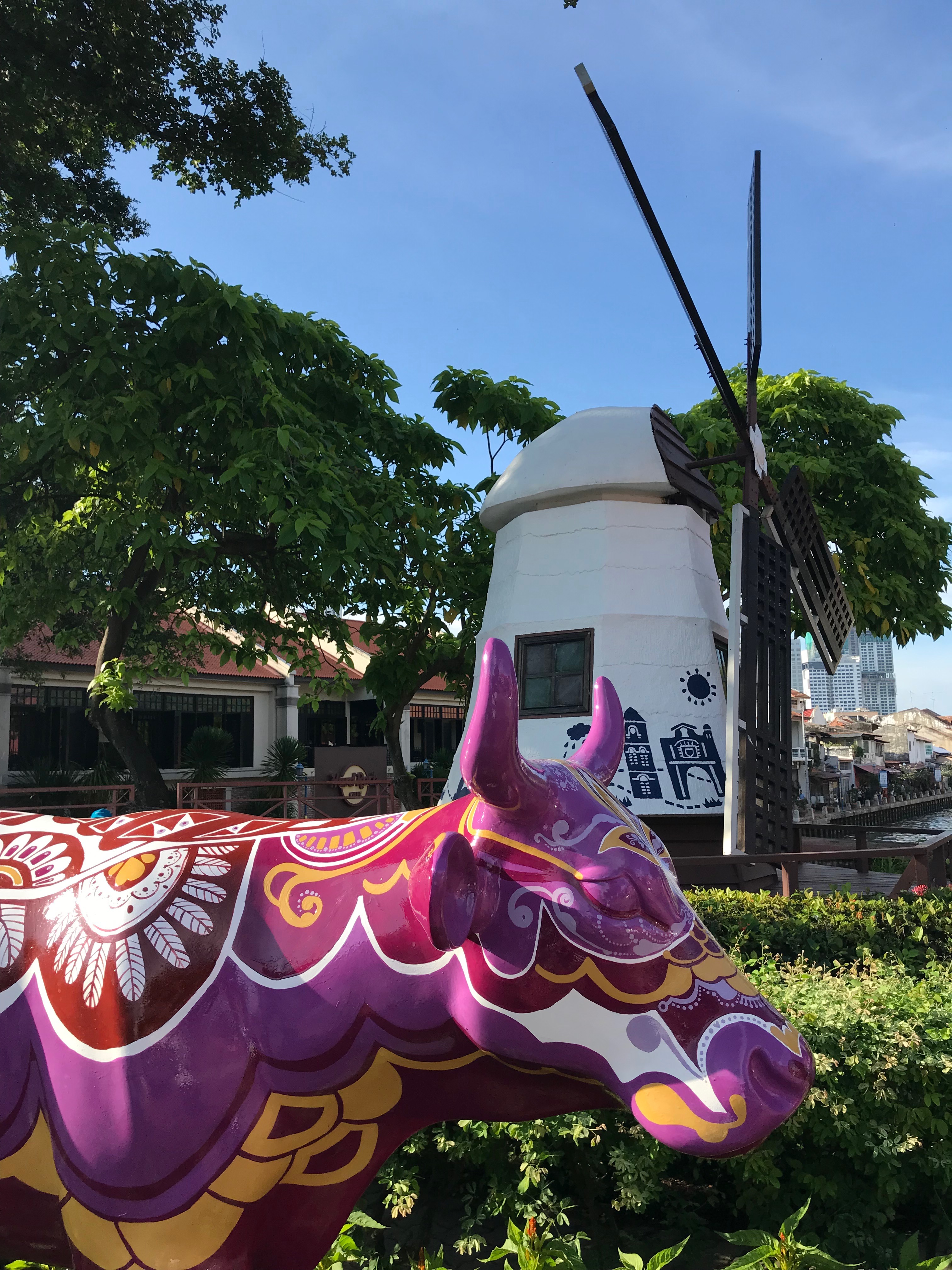 Am Abend sind wir wieder zu zweit ein paar Strassen weiter spazieren. Die historischen Häuser, die Stadtmauer mit alten Geschützen der Portugiesen und Holländer sowie die schmalen Wege verleiten zum verträumten Schlendern. Wenn nicht, ja wenn nicht diese unglaublich lautschrill-bunten und blinkenden Rikscha-Taxis mit plärrender chinesischer und malaiischer Schlagermusik durch die Gassen fegen würden. Aber auch das gehört zu Melaka.