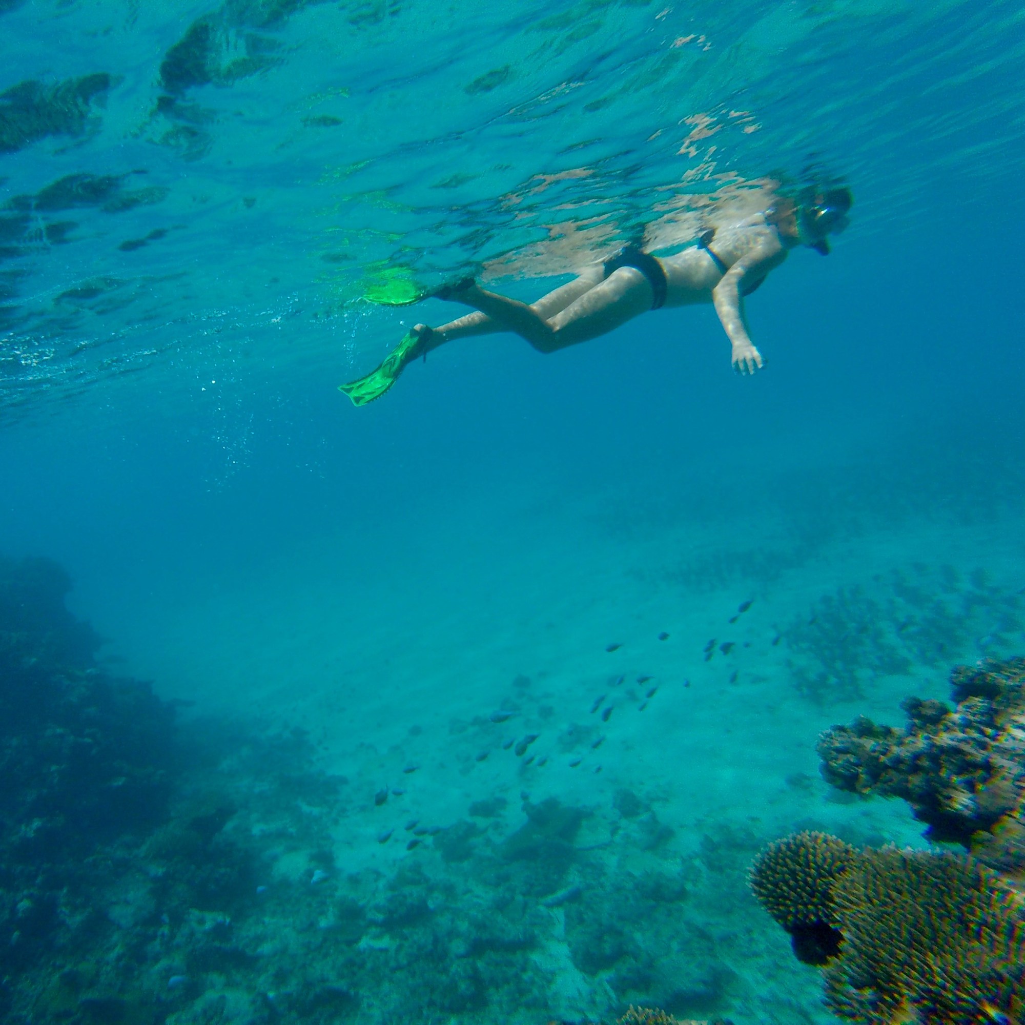 Es ist flach und wir stellen fest, das wir nur wenig Platz zwischen uns und den Seepflanzen und später auch den ersten Korallen haben. Um uns an den scharfen Korallen nicht zu verletzen, erkundigen wir uns nach den Gezeiten, so das wir an den Folgetagen erst bei Flut wieder ins Meer gehen. Unsere Ausflüge werden von Tag zu Tag länger. Wir haben Spass, obwohl zumindest meine Schwimmkünste überschaubar sind und sicher nicht Rettungsschwimmerqualtitäten haben. Während Jana recht geschmeidig und ausdauernd durch das Wasser gleitet, fühle ich mich eher wie ein Eisbär, der über kurze Strecken schnell und wendig agiert, jedoch froh ist, bald wieder auf seiner geliebten Eisscholle zu pausieren.