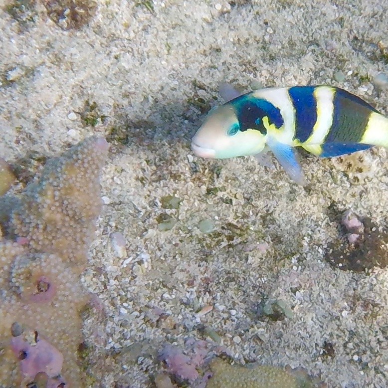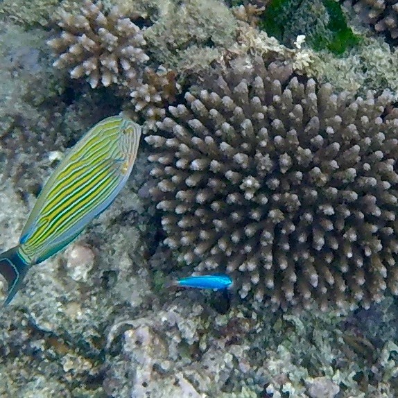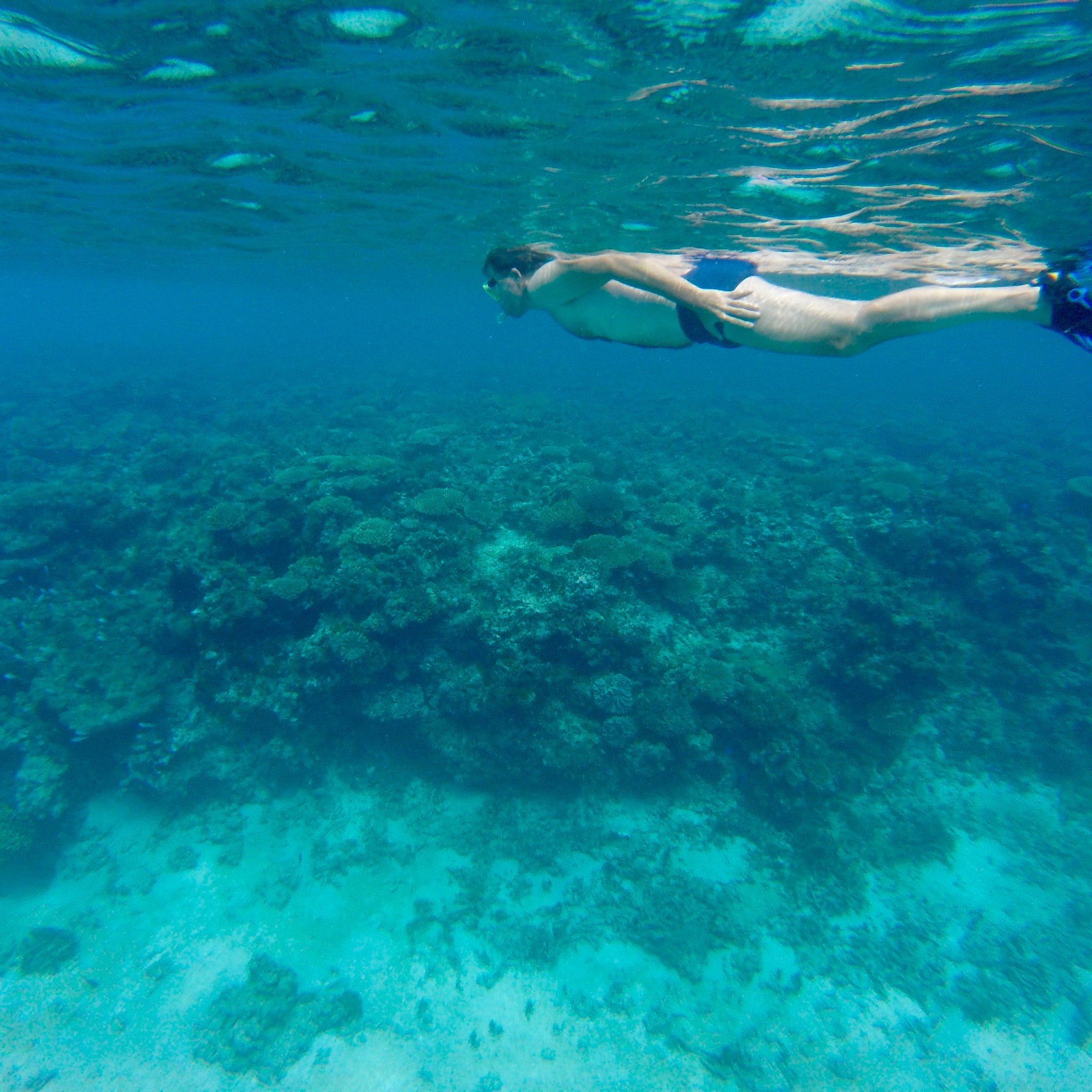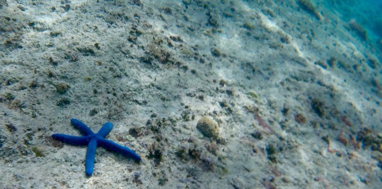 Ich bin beeindruckt von der Vielfalt des Lebens unter Wasser: Blaue Seesterne, Seegurken oder einfach nur jede Menge farbiger Fische. Deutlich wird auch, das sie sich vor allem an den Korallen aufhalten. In den Abschnitten, wo es nur Sand, Steine oder Muschel – bzw. Korallenreste zu sehen gibt, sind kaum Fische vorzufinden. Einmal bekommen wir nur wenige Meter unter uns tatsächlich eine schwarzweissgestreifte Seeschlangen zu Gesicht. Diese sind hochgiftig, jedoch absolut nicht an Menschen interessiert. Trotzdem mischt sich in die Entdeckerfreude ein kleiner Schrecken. Und immer wieder gibt es diese wunderbaren Momente, wenn ich in einen Schwarm kleiner blauer Fische hinein schwimme und für Sekundenbruchteile ein Teil von ihnen zu sein scheine.