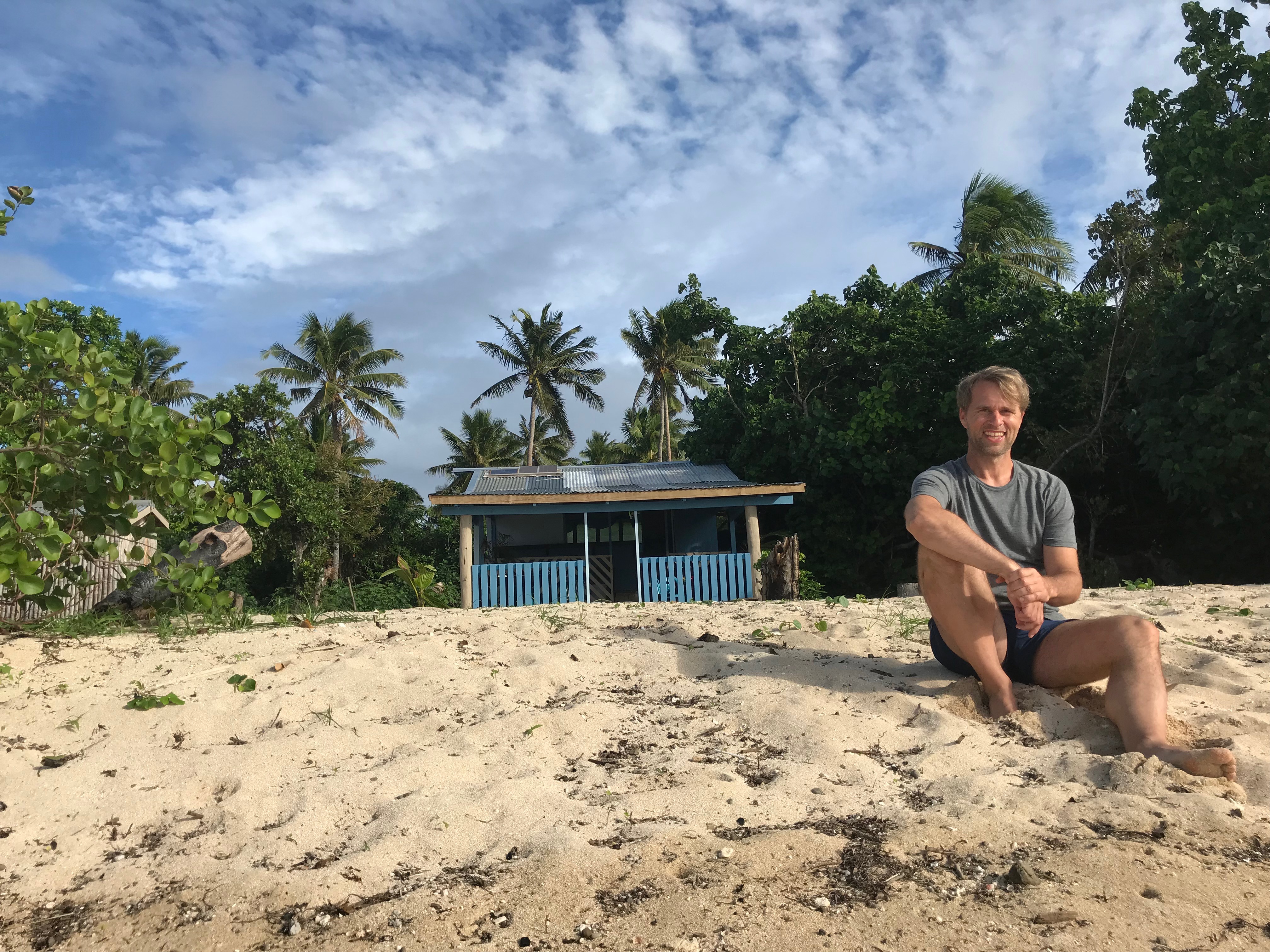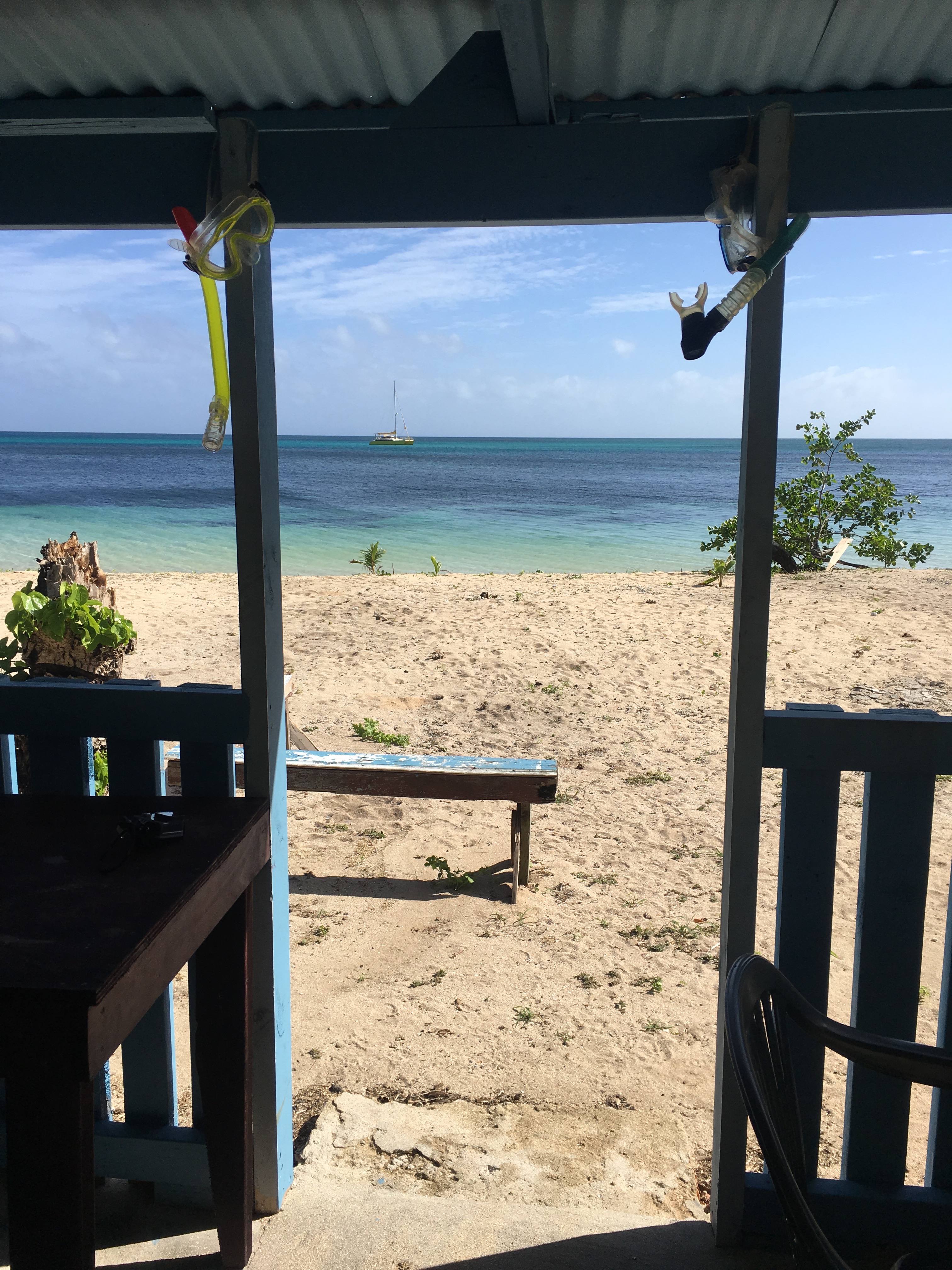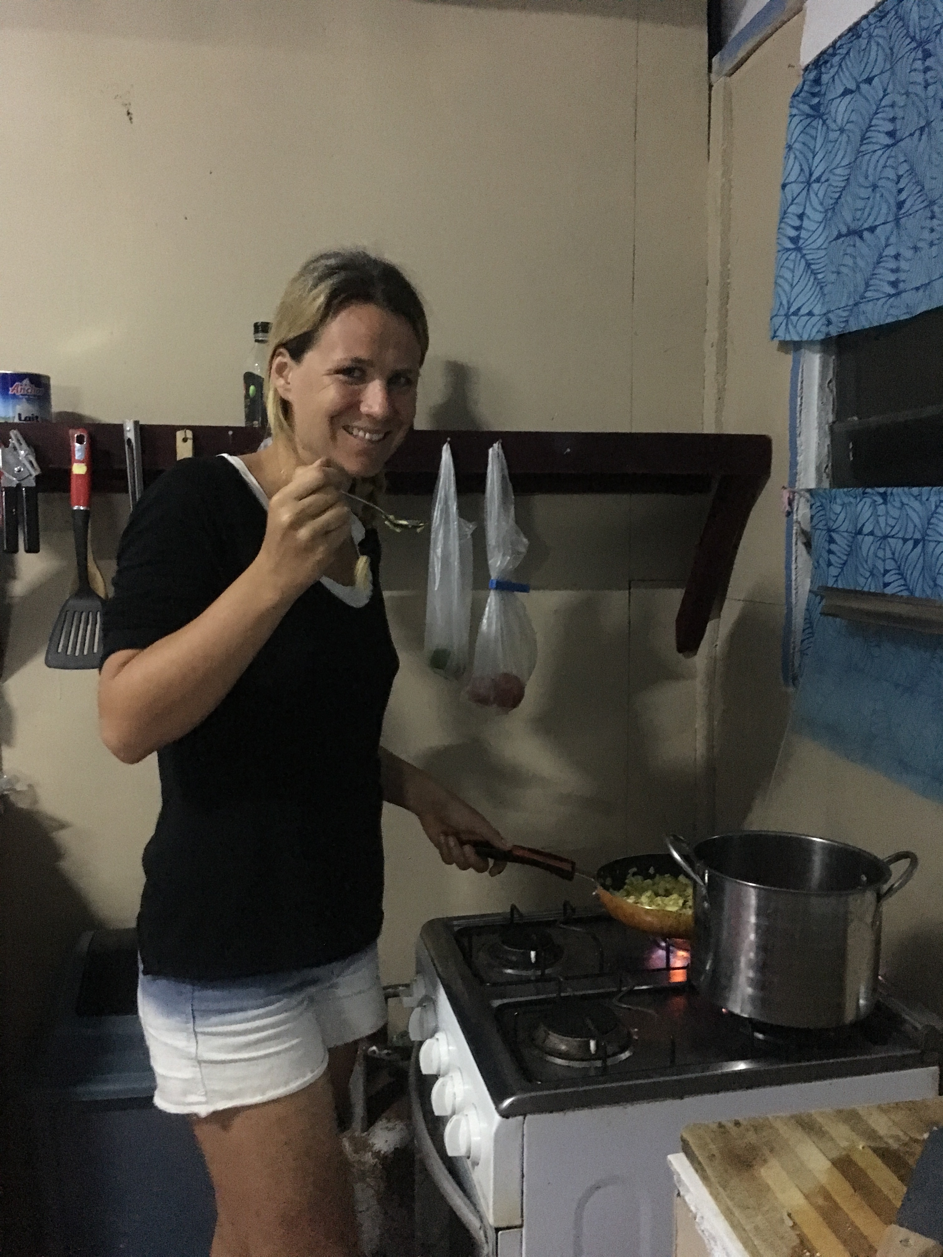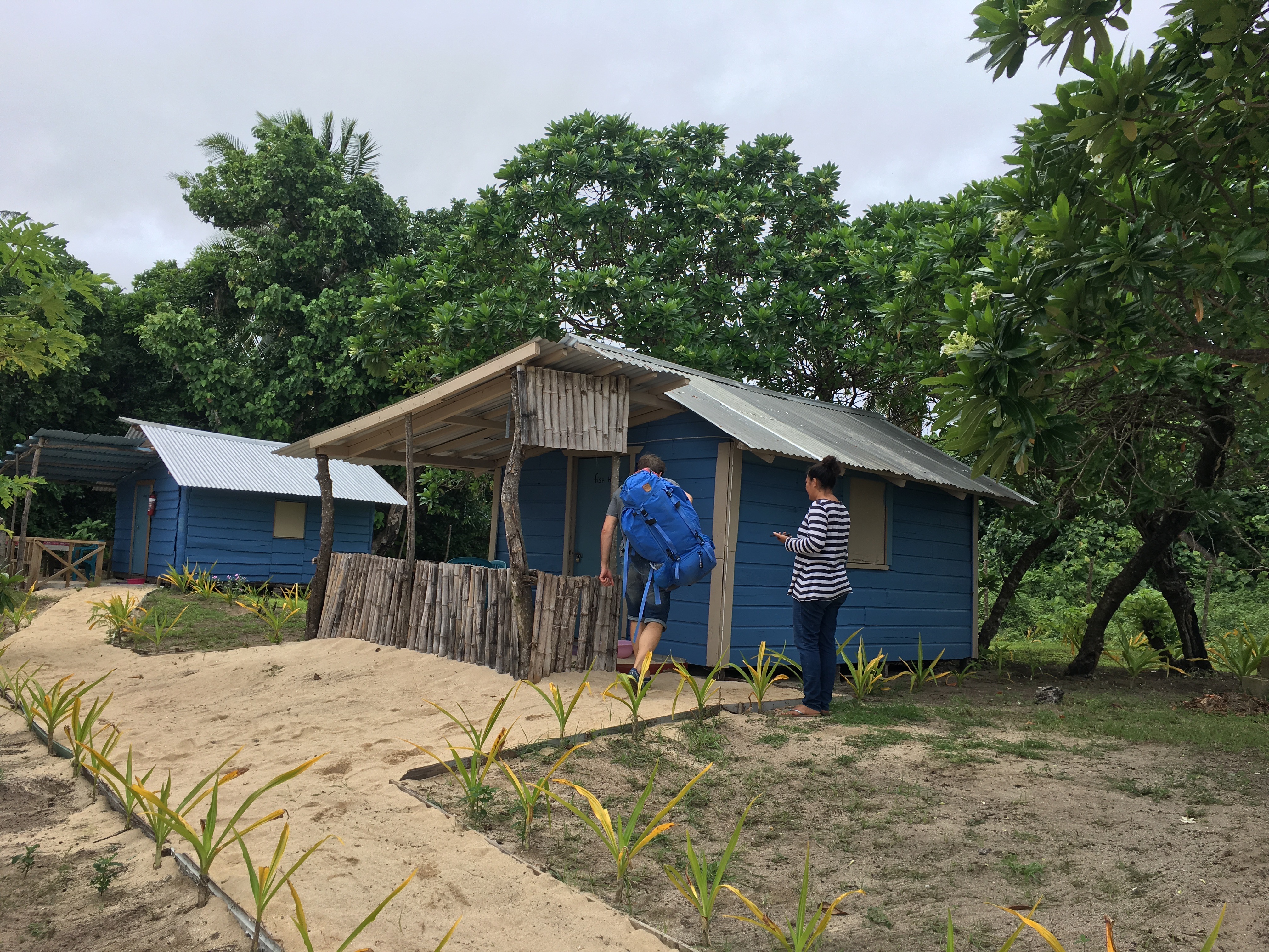 Ein Plätzchen direkt am Strand und zwei Hängematten zwischen Palmen mit Meerblick am absoluten Ortsrand mitten im Busch. Zwei Hütten für jeweils zwei Personen sind schon gebaut und bezugsfertig, eine Dritte ist noch geplant. Es gibt eine Gemeinschaftsküche mit überdachter Terrasse und drei Tischen sowie passender Bestuhlung. Daneben steht ein Häuschen mit Dusche/Toilette für alle Gäste. Verwendet wird Regenwasser. Licht gibt es aus der Solarstromanlage vom Dach, das Gas für den Herd kommt aus der Gasflasche. Steckdosen sind hier allerdings Fehlanzeige. Ich merke wie abhängig wir doch sind. Steckdosen oder Ladestationen für elektronische Geräte sind ja bekanntlich die neuen Brunnen. Schliesslich kommt das Wasser hier in Form von Regen verlässlich mindestens ein Mal pro Tag von oben, aber für eine Steckdose ist die dürftig zusammengekittete Solaranlage wohl zu schwach. Unsere Powerbank liefert unseren Geräten Strom für die ersten sechs Tage. Danach muss der Grundstücksbesitzer den benzinbetriebenen Generator anwerfen, um alles wieder aufzuladen.