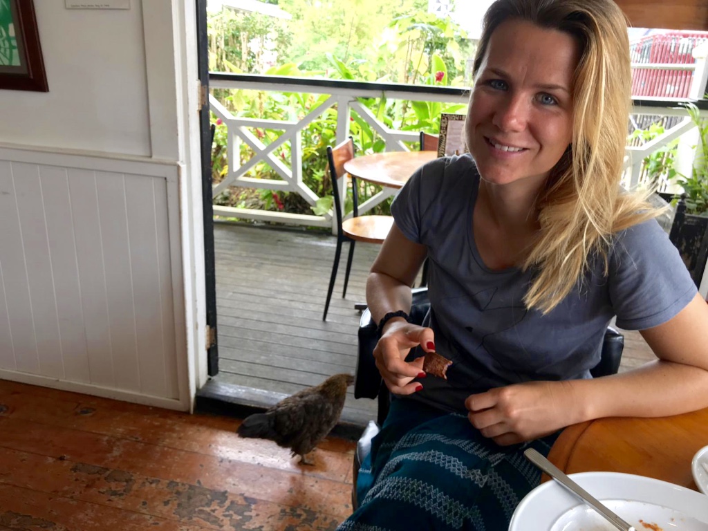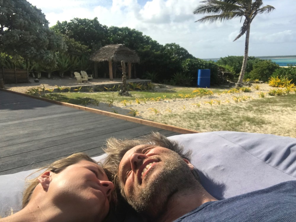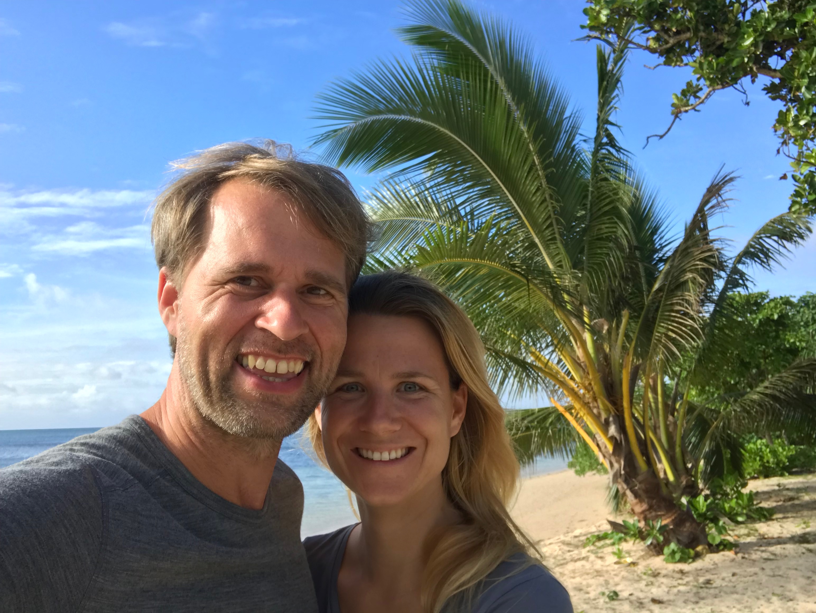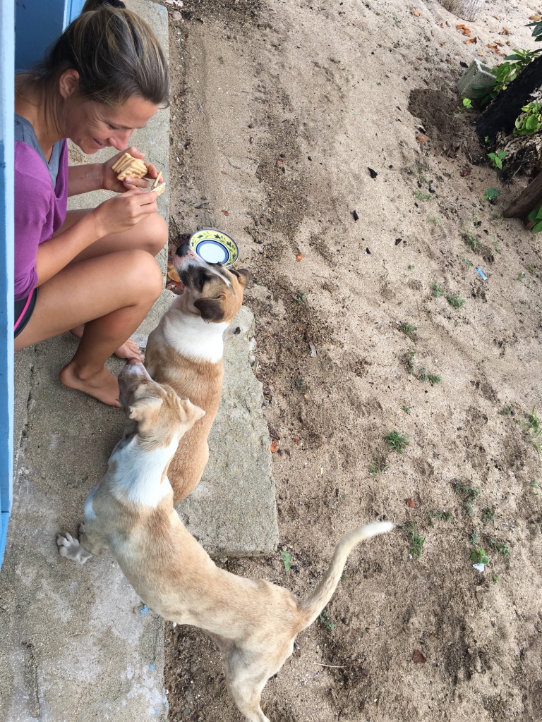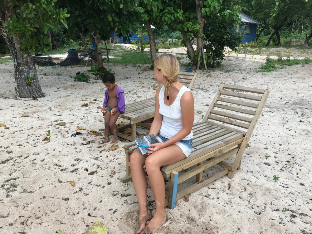 Ein Plätzchen direkt am Strand und zwei Hängematten zwischen Palmen mit Meerblick am absoluten Ortsrand mitten im Busch. Zwei Hütten für jeweils zwei Personen sind schon gebaut und bezugsfertig, eine Dritte ist noch geplant. Es gibt eine Gemeinschaftsküche mit überdachter Terrasse und drei Tischen sowie passender Bestuhlung. Daneben steht ein Häuschen mit Dusche/Toilette für alle Gäste. Verwendet wird Regenwasser. Licht gibt es aus der Solarstromanlage vom Dach, das Gas für den Herd kommt aus der Gasflasche. Steckdosen sind hier allerdings Fehlanzeige. Ich merke wie abhängig wir doch sind. Steckdosen oder Ladestationen für elektronische Geräte sind ja bekanntlich die neuen Brunnen. Schliesslich kommt das Wasser hier in Form von Regen verlässlich mindestens ein Mal pro Tag von oben, aber für eine Steckdose ist die dürftig zusammengekittete Solaranlage wohl zu schwach. Unsere Powerbank liefert unseren Geräten Strom für die ersten sechs Tage. Danach muss der Grundstücksbesitzer den benzinbetriebenen Generator anwerfen, um alles wieder aufzuladen.