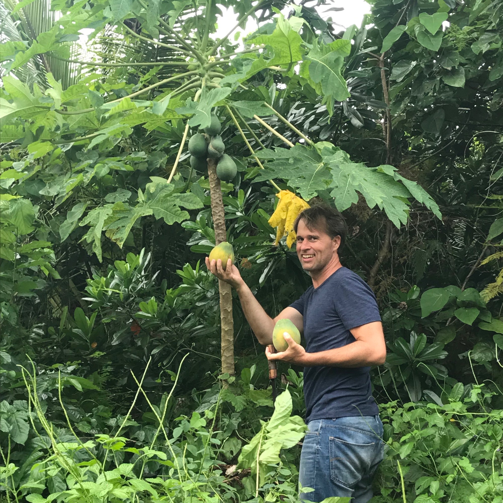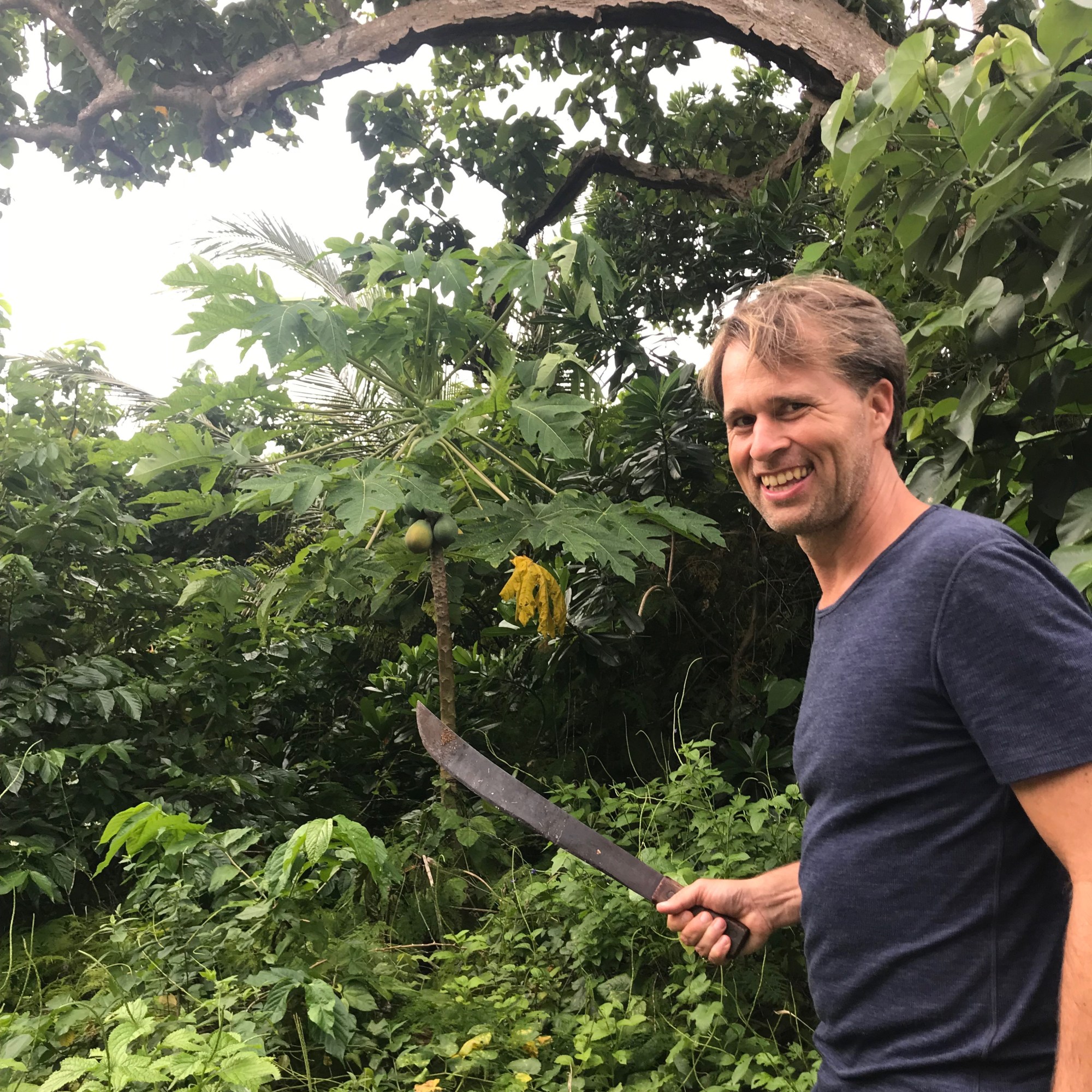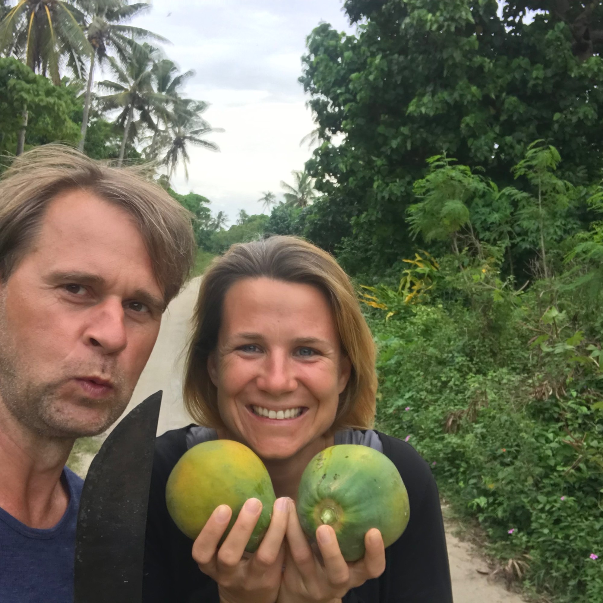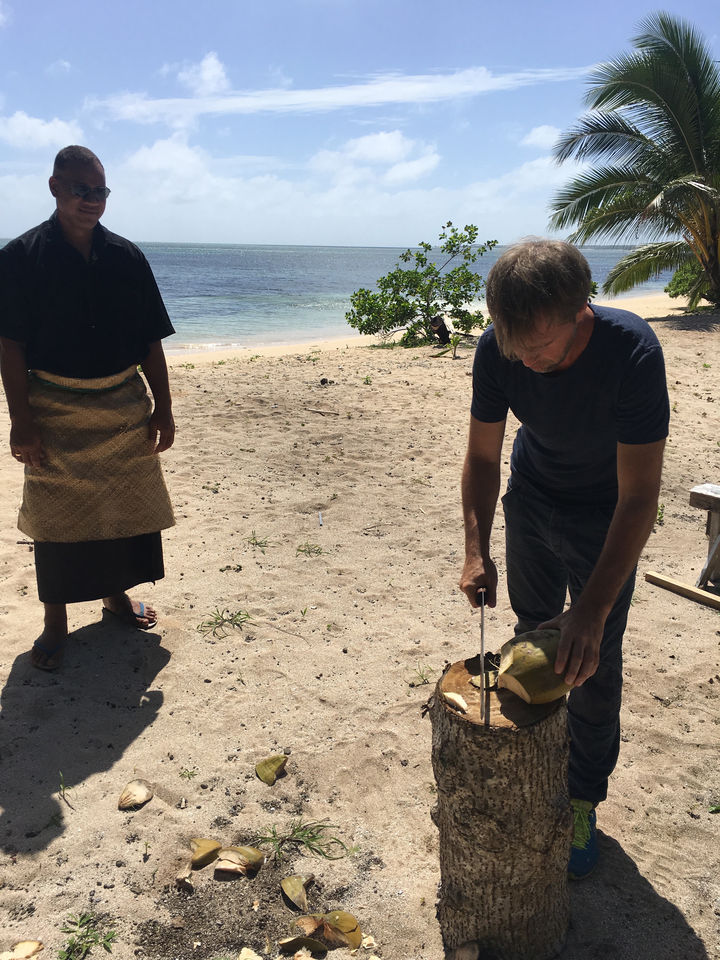 Unsere Gastgeber zeigen sich verständnisvoll und bringen uns nun regelmässig frische Kokosnüsse und Papayas aus dem Busch mit. Jana und ich werden sogar im Kokosnussspalten fachgerecht unterwiesen, damit wir auch ohne fremde Hilfe nicht an der harten Nuss verzweifeln. Das dafür benötigte Werkzeug, eine Machete, wird uns für die Zeit des Aufenthaltes überlassen.