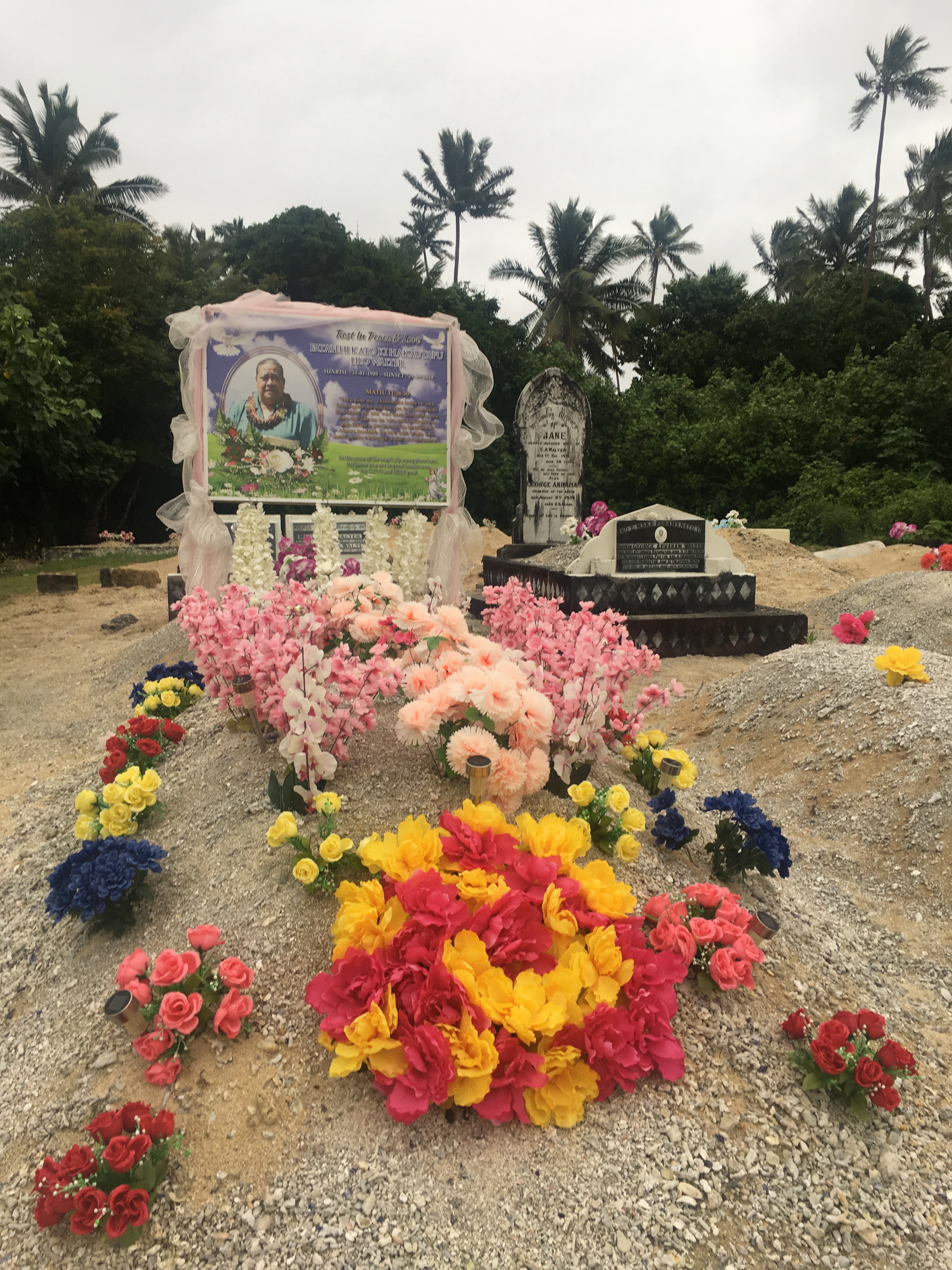 Auffällig ist die grosse Anzahl von Kirchen und Grabstätten. Auf Tonga dominieren die sogenannten Freien Kirchen (Methodisten, Kirche Jesu Christi der Heiligen der Letzten Tage/Mormonen, Siebenten-Tags-Adventisten und Assembly of God sind die vier grössten Gruppen). Diejenigen, die es sich leisten können, nutzen die Möglichkeit, ihre Verstorbenen auf ihren privaten Grundstücken zu beerdigen. Dadurch scheint die Religion und der Tod visuell präsenter als gewohnt. Die Gräber wirken nicht düster, eher bunt, mit Fähnchen, Windrädern oder Permanentfotos der Verstorbenen. Über einem Grab hängt sogar ein riesiges Schild mit „Happy Birthday“, was schon etwas makaber auf uns wirkt.