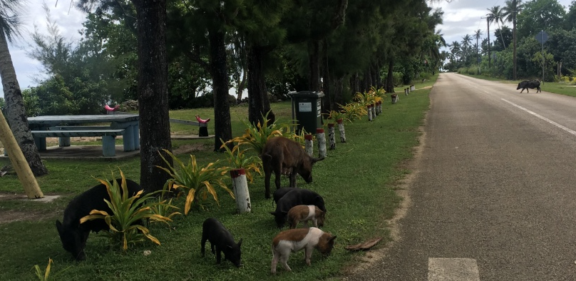 Die Geringschätzung vegetarischer Kost wird unter anderem auch dadurch ausgedrückt, das die reichlich vorhandenen Kokosnüsse selten auf dem eigenen Teller landen, sondern an die vielen frei herumlaufenden Hausschweine verfüttert werden. Das Aroma beim späteren Verzehr dürfte ziemlich einzigartig sein, was wir jedoch nie erfahren werden. Letztlich bleibt uns nicht anders übrig als verschrumpelte, importierte Äpfel, Orangen und Birnen aus Neuseeland in den chinesischen Mini-Shops zu kaufen. Was für ein Frevel.
